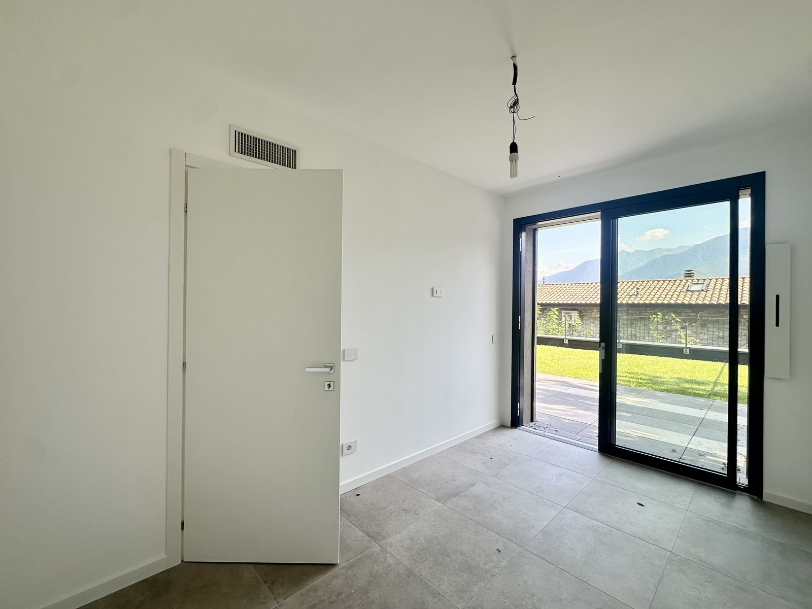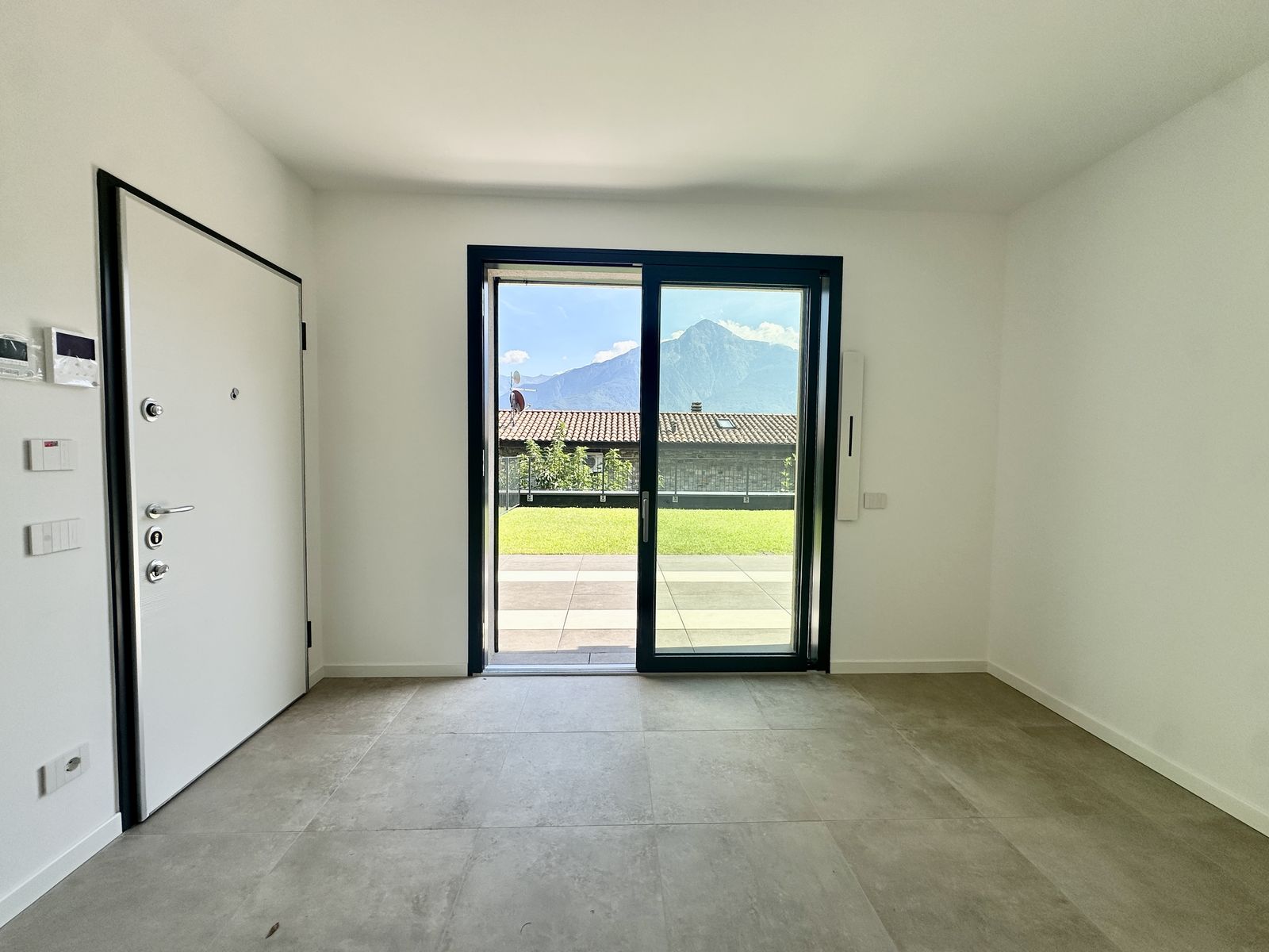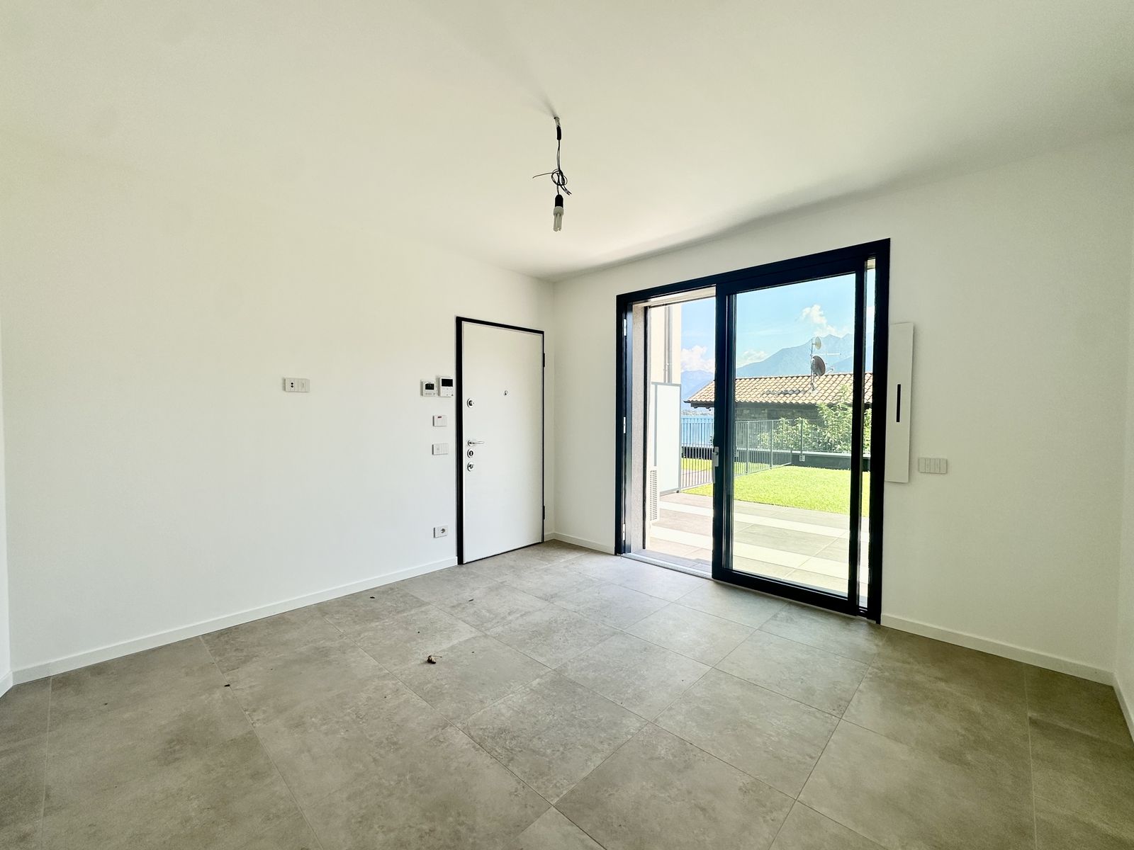 The apartment of about 48 sqm includes a living room with kitchen area and large French door opening onto a private garden of approx. 80 sqm, hallway leading to the double bedroom (also facing the garden) and the bathroom with window, shower box and full furnishings. Facing Mount Legnone with a glimpse of the lake.