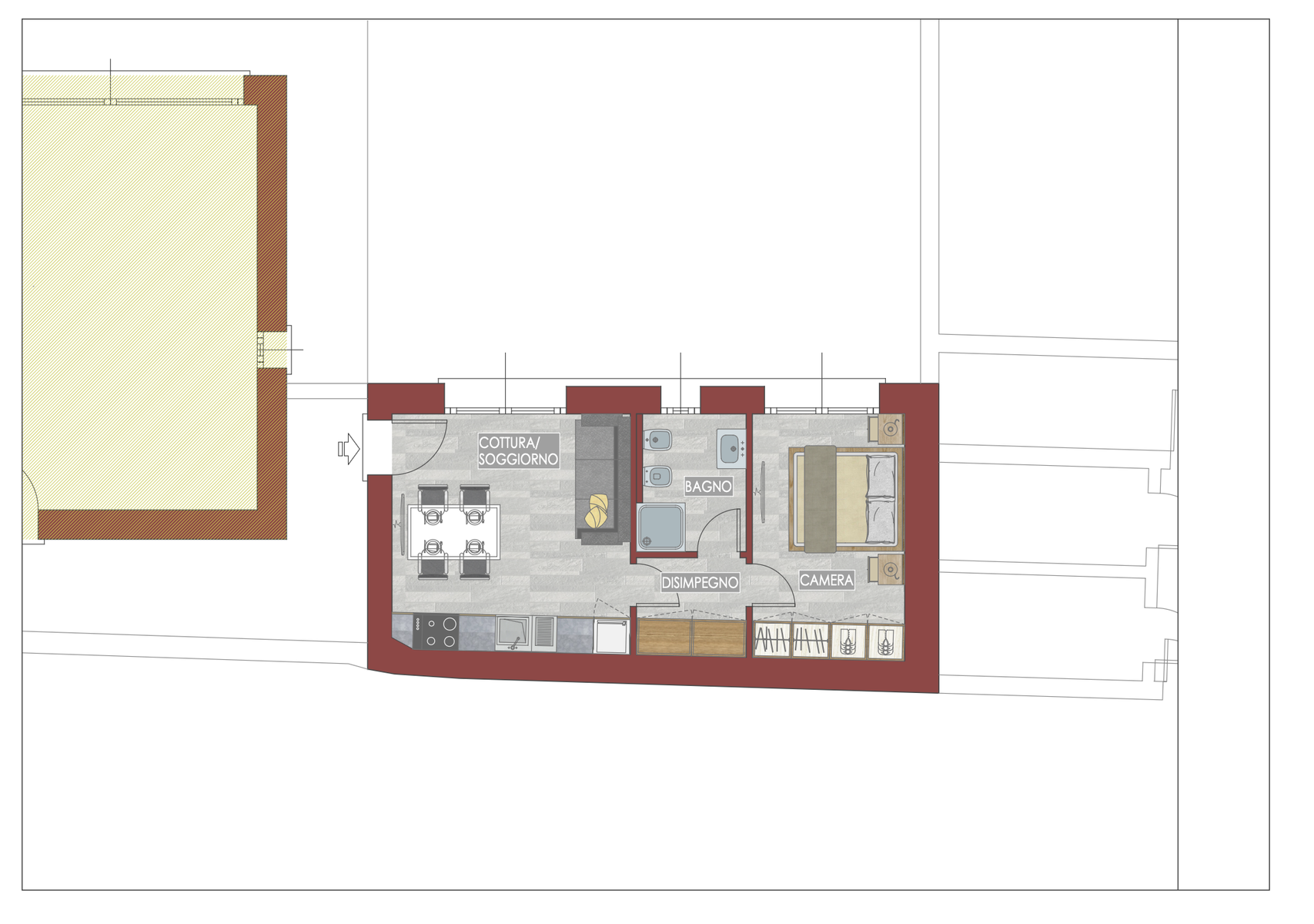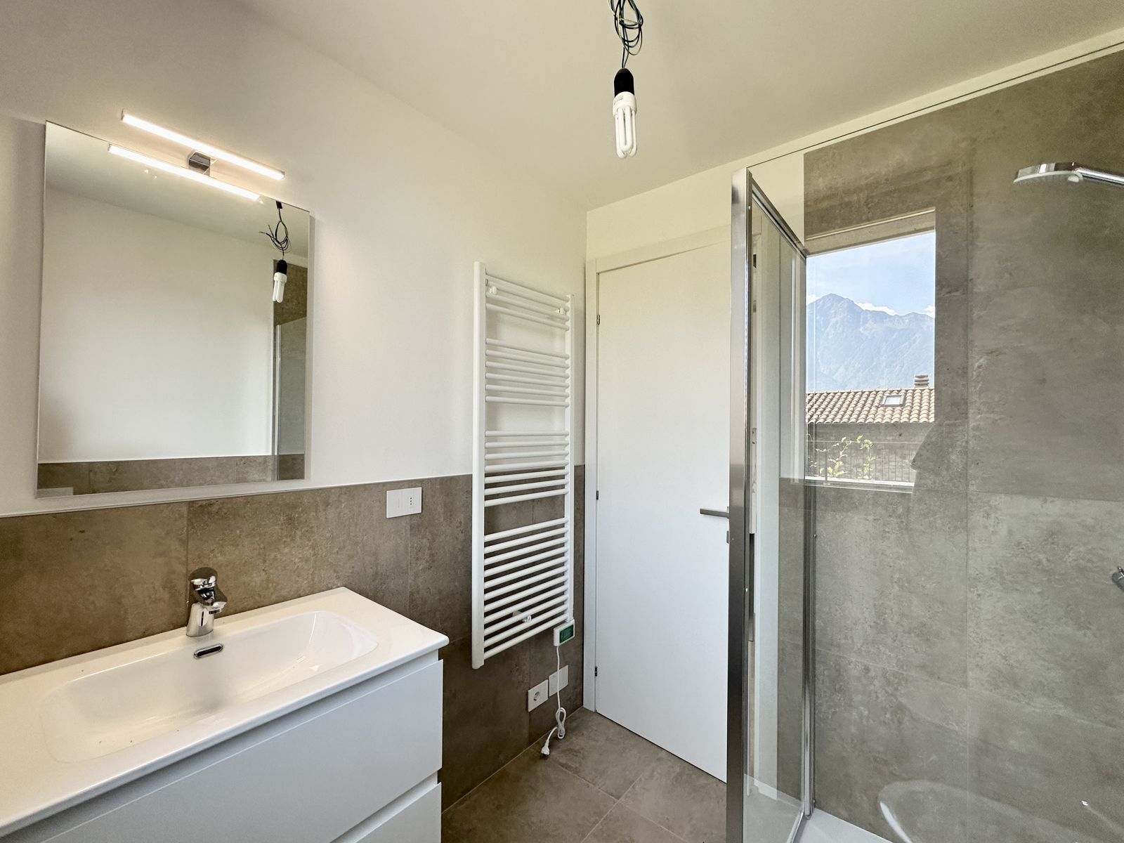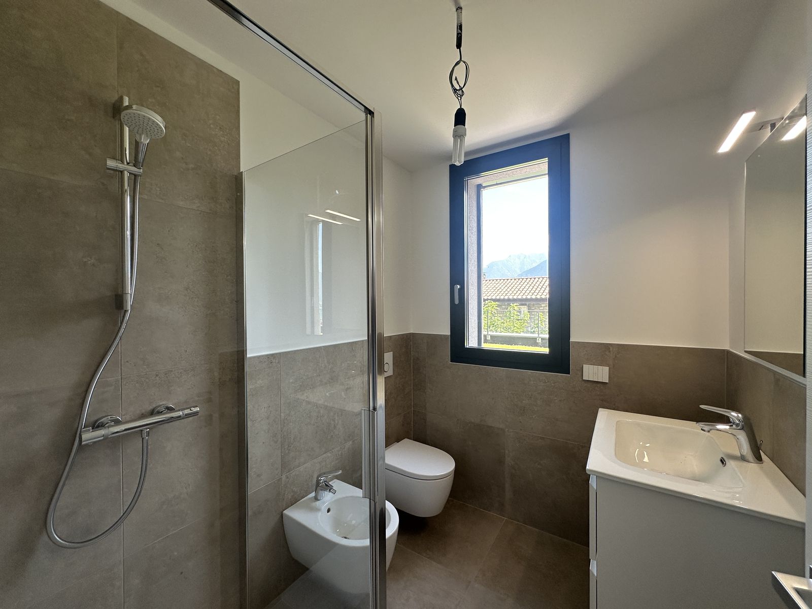 The apartment of about 48 sqm includes a living room with kitchen area and large French door opening onto a private garden of approx. 80 sqm, hallway leading to the double bedroom (also facing the garden) and the bathroom with window, shower box and full furnishings. Facing Mount Legnone with a glimpse of the lake.
