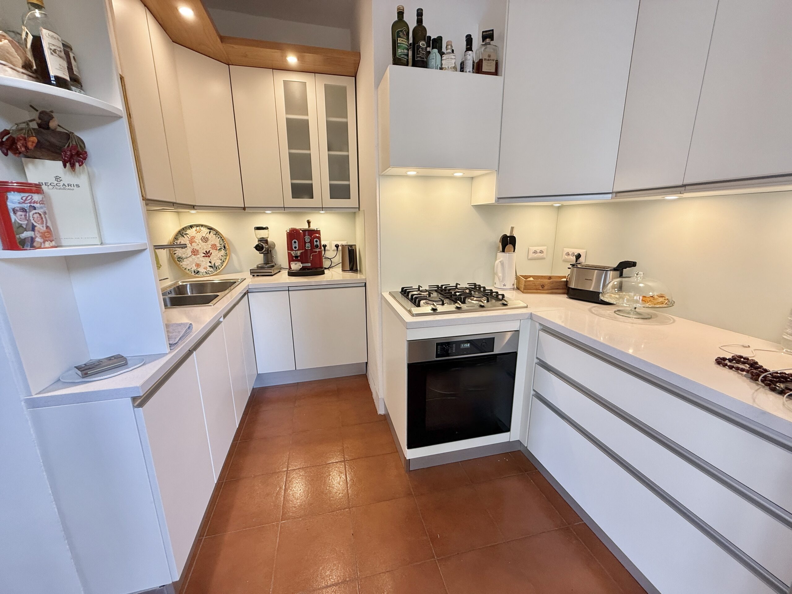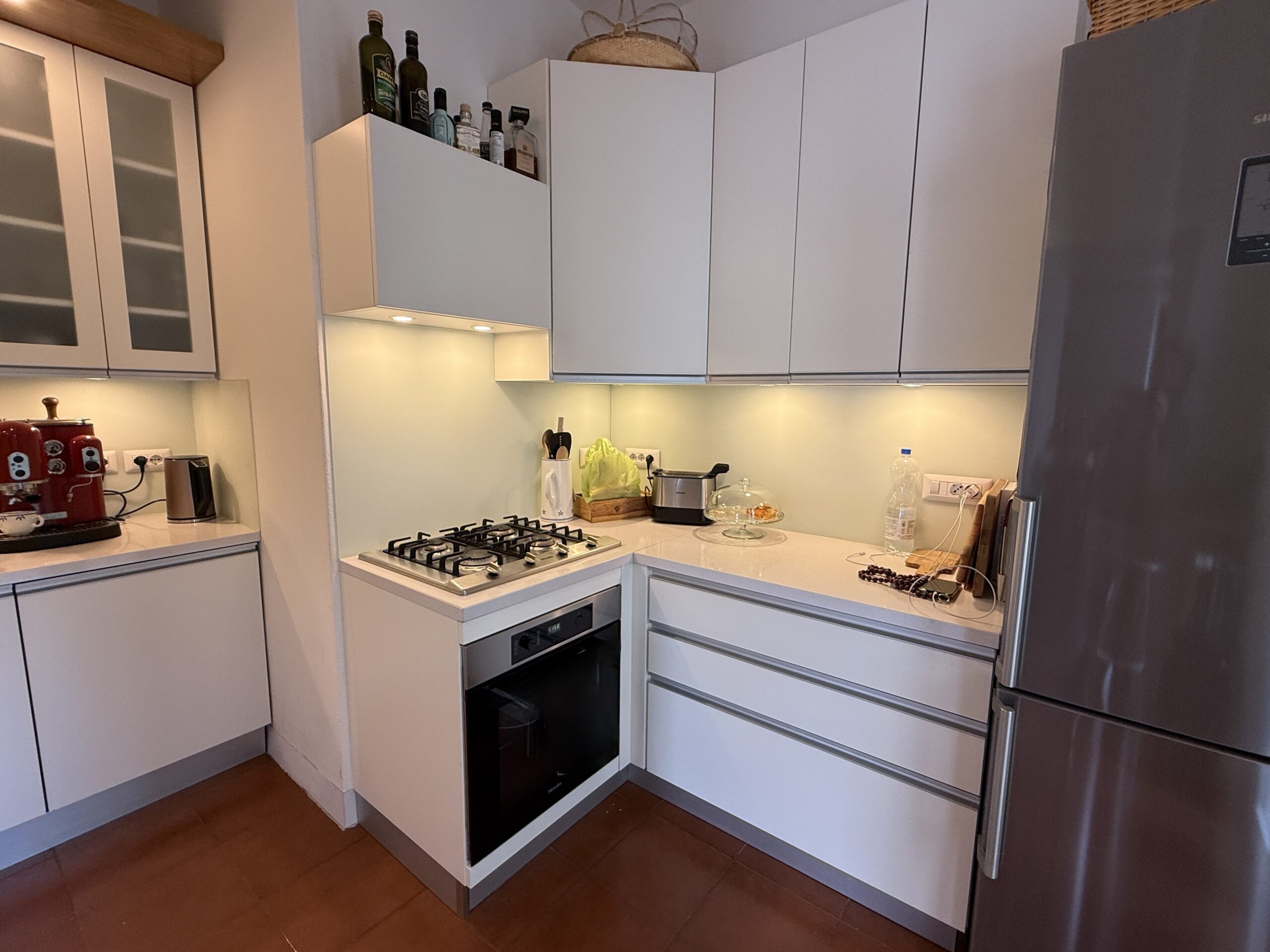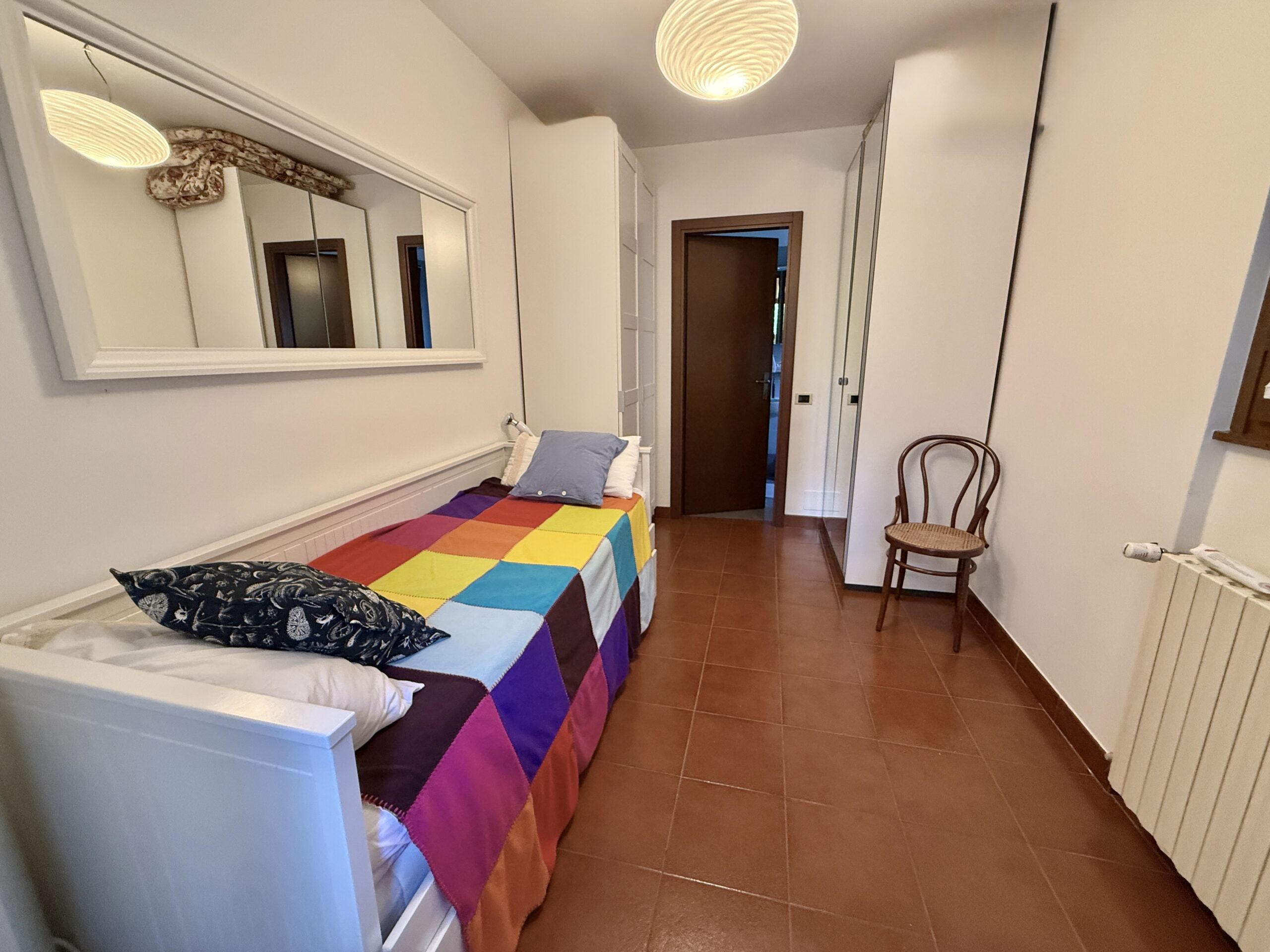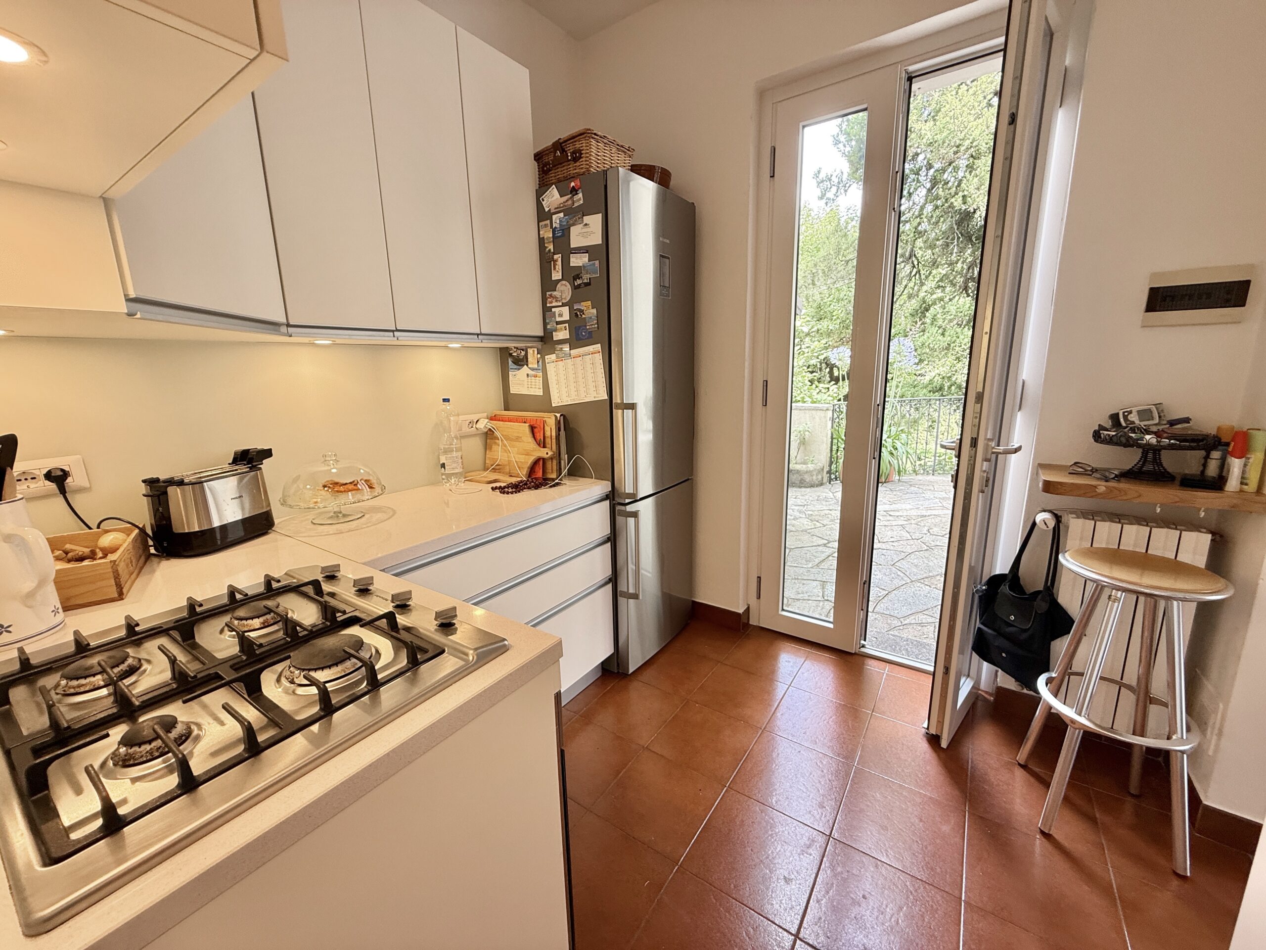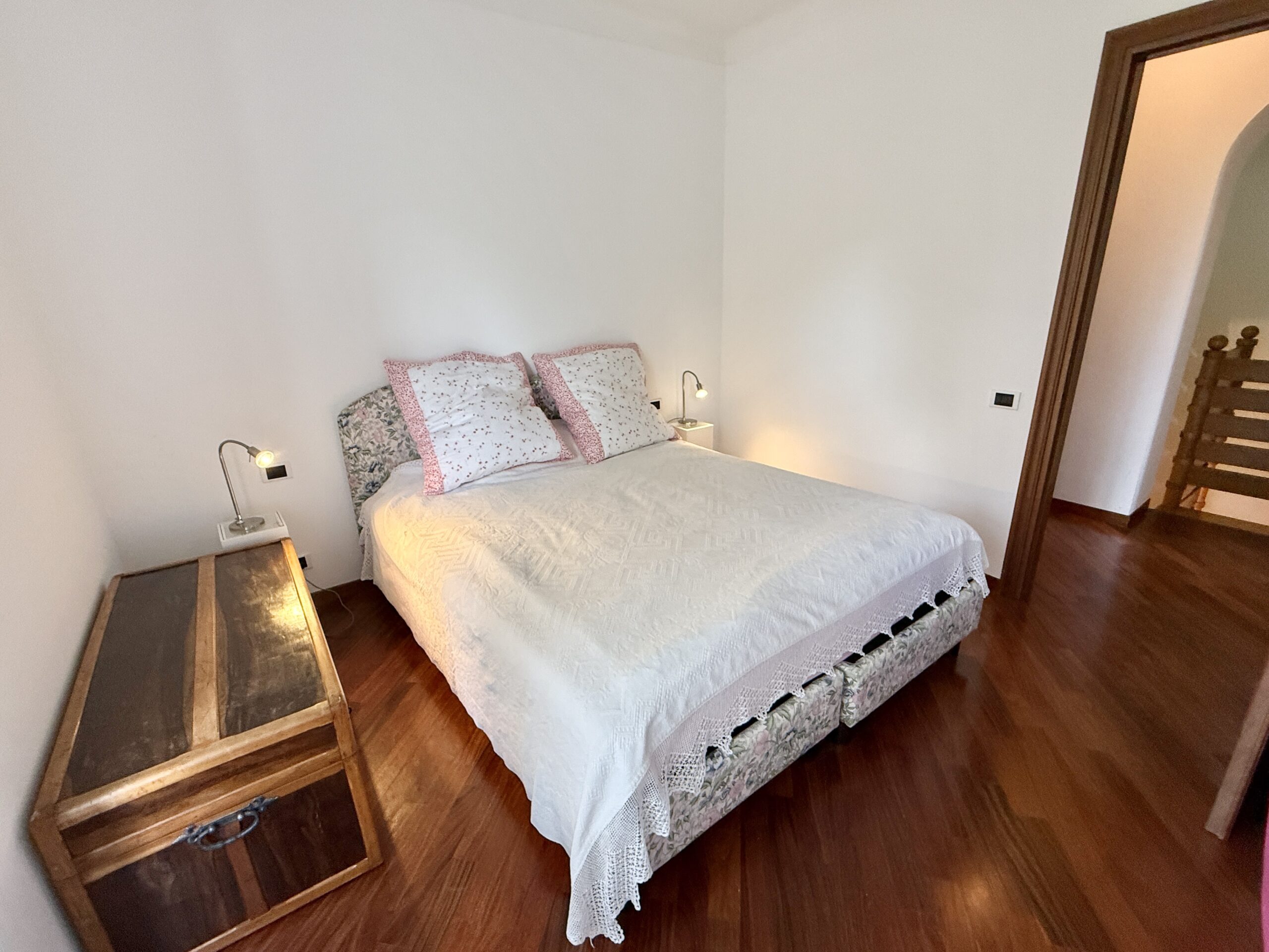 The property, approximately 130 sqm in size, is arranged over two levels and stands out for its bright interiors, elegant finishes, and the charm of its original fireplace.