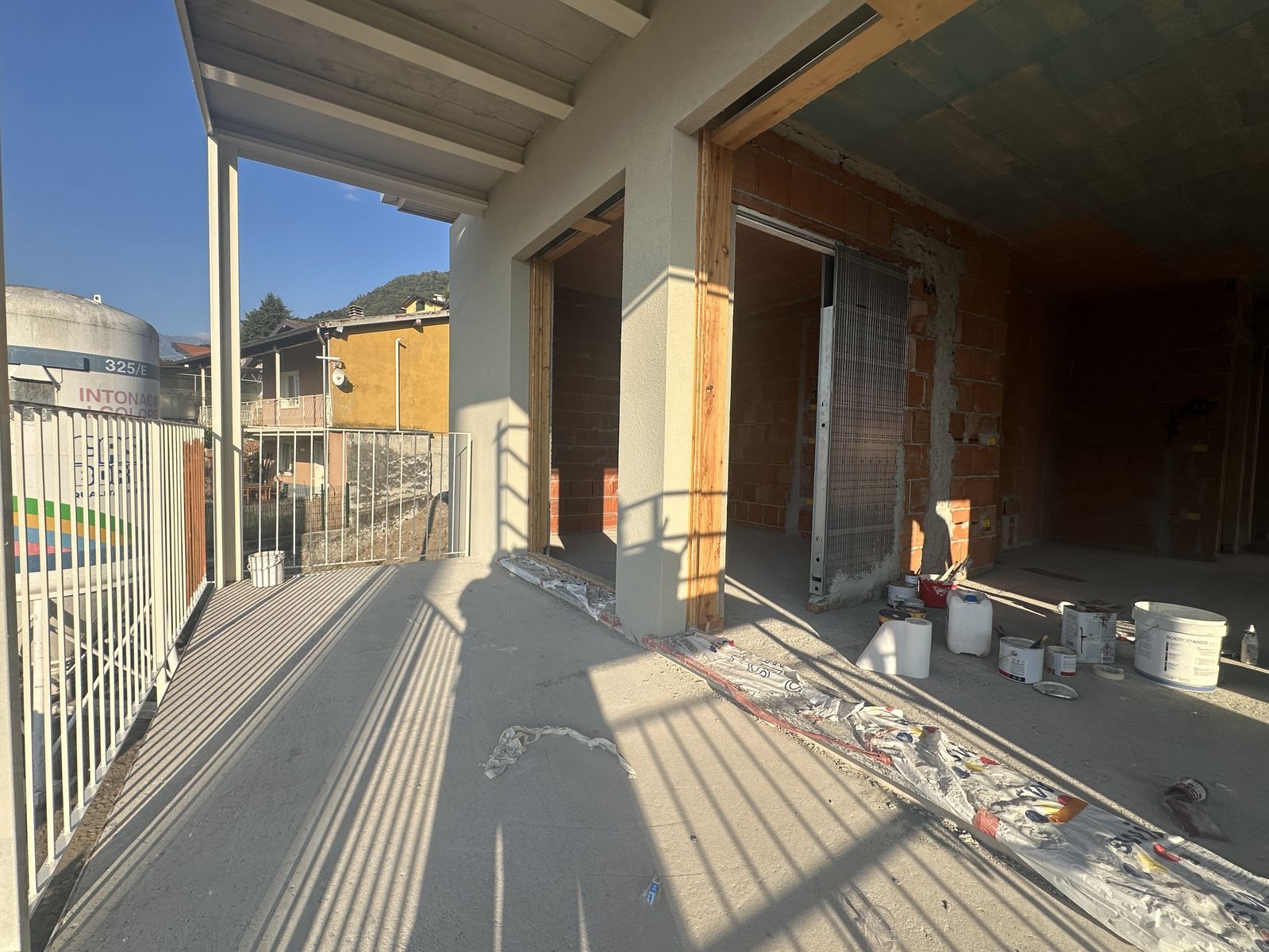Entrance hall leading directly into a spacious living room with kitchen area, opening onto a covered portico (13.68 sqm) and a private flat garden of approx. 64 sqm with panoramic mountain views.